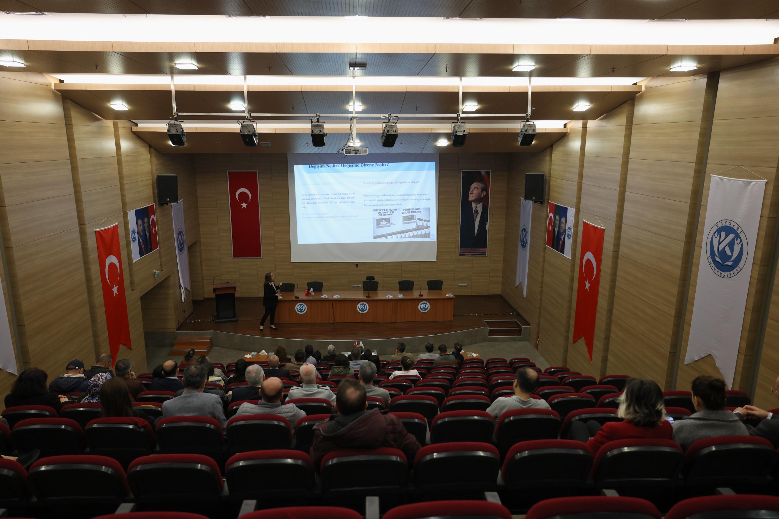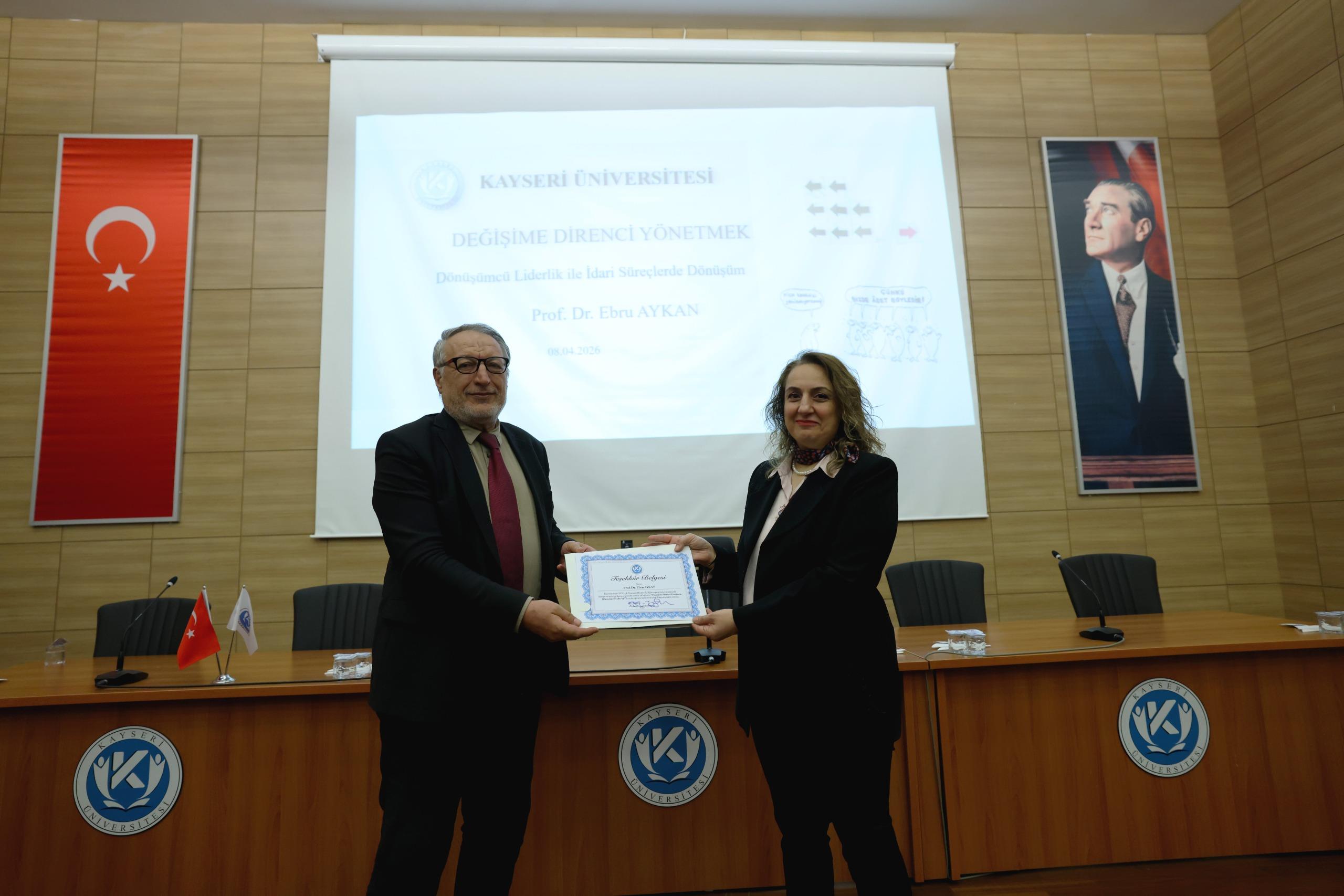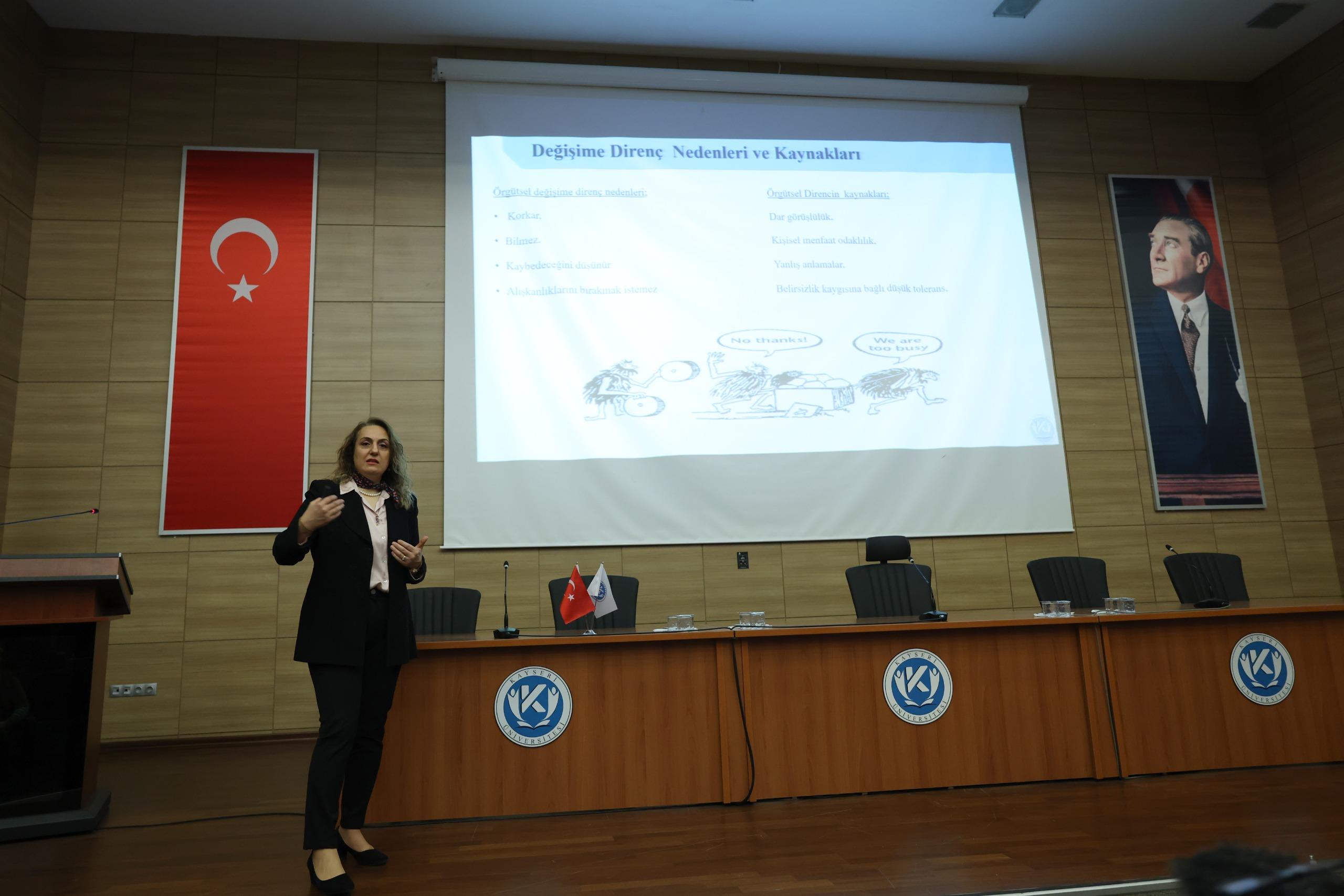 Kayseri Üniversitesi 2026 Yılı Hizmet İçi Eğitim Planlaması kapsamında; Üniversitemiz Uygulamalı Bilimler Fakültesi bünyesinde görev yapan Prof. Dr. Ebru AYKAN tarafından 08.04.2026 tarihinde saat 10:00'da “Değişime Direnci Yönetmek: Dönüşümcü Liderlik” konulu eğitim gerçekleştirilmiştir.